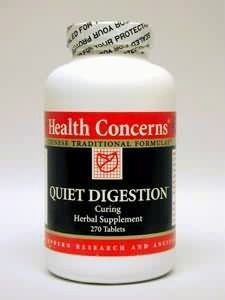 Health Concerns Quiet Digestion - 270 Tablets Quiet Digestion 270 tabs Chinese Therapeutic Actions: Regulate Stomach, Resolve Spleen Dampness, and Food Stagnation Ingredients: Poria (Fu Ling), Coix (Yi Yi Ren), Shen Chu (Shen Qu), Magnolia (Hou Po), Angelica (Bai Zhi), Pueraria (Ge Gen), Red Atracylodes (Cang Zhu), Saussurea (Mu Xiong), Pogostemon (Huo Xiang), Oryza (Gu Ya), Trichosanthes root (Tian Hua Fen), Chrysanthemum (Ju Hua), Halloysite (Chi Shi Zhi), Citrus (Ju Hong), Mentha (Bo He), Malt